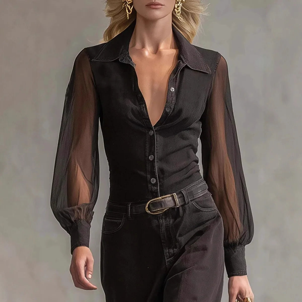 This unique dress fuses soft femininity with classic denim structure for a look that’s daring yet refined. Featuring sheer bishop sleeves and a sharply tailored silhouette, it brings effortless confidence to both daytime city strolls and evening soirées.