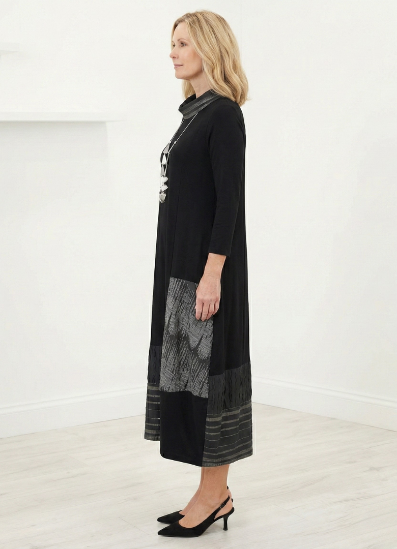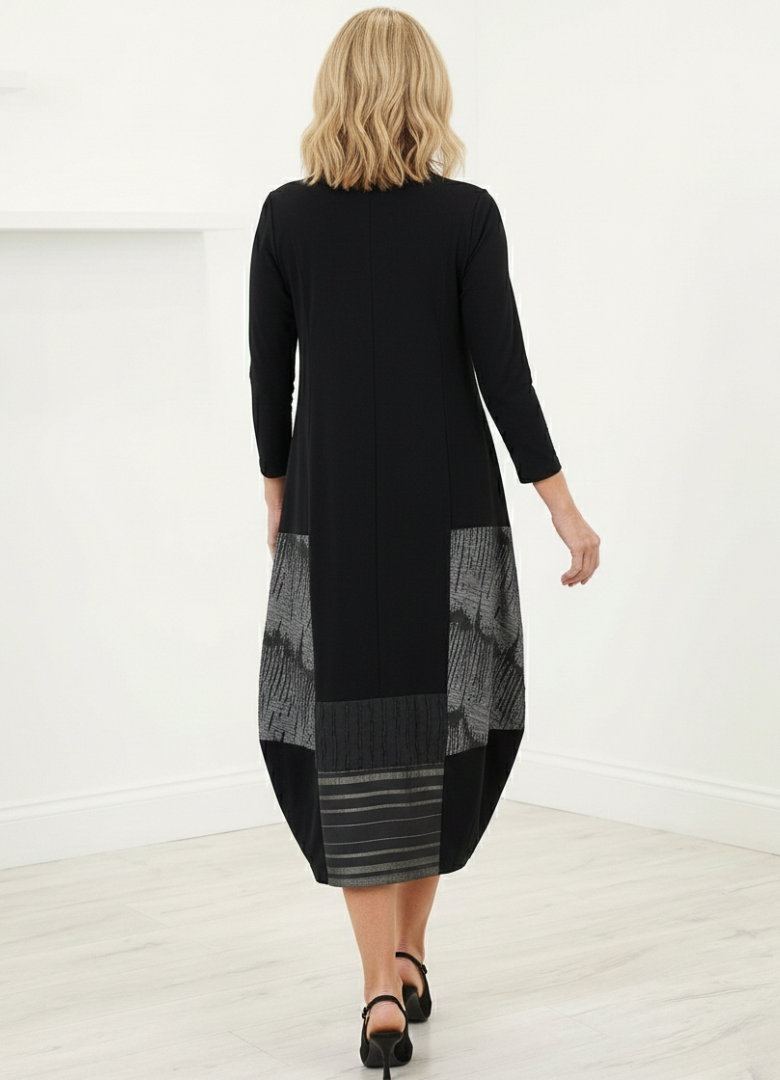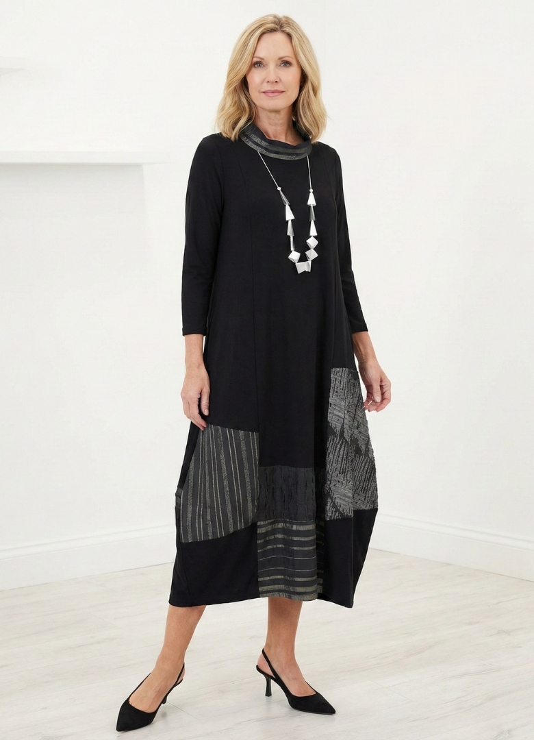 Designed for the woman who loves pieces that feel unique yet easy to wear, the Margaret Dress blends clean lines with modern texture. The soft knit top keeps you comfortably covered while the mesh-trimmed hem adds movement, interest and a touch of understated elegance—perfect for dinners, gatherings or simply feeling polished without trying too hard.