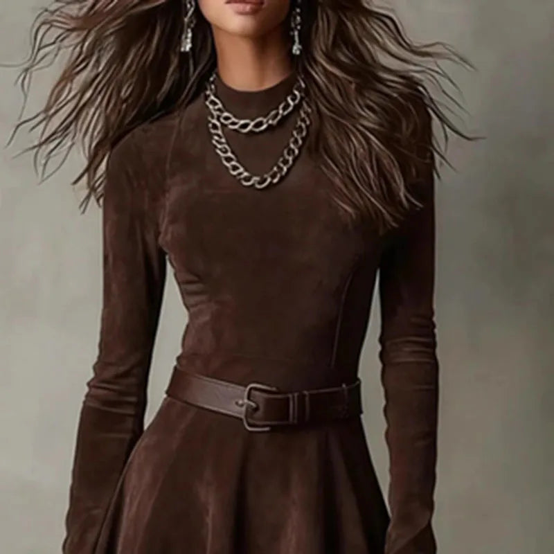 This flattering A-line mini dress is crafted from soft faux suede that hugs the upper body and flares into a playful skirt. The structured waist with matching belt elevates the silhouette, while long sleeves and high neckline add balance and elegance to its daringly short hemline.